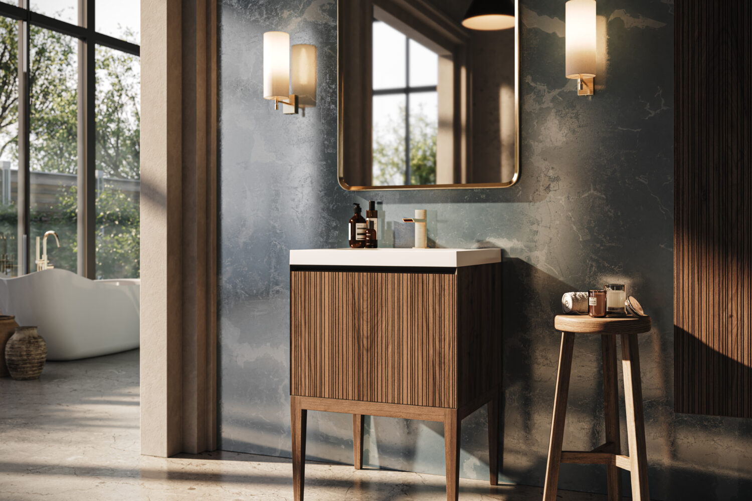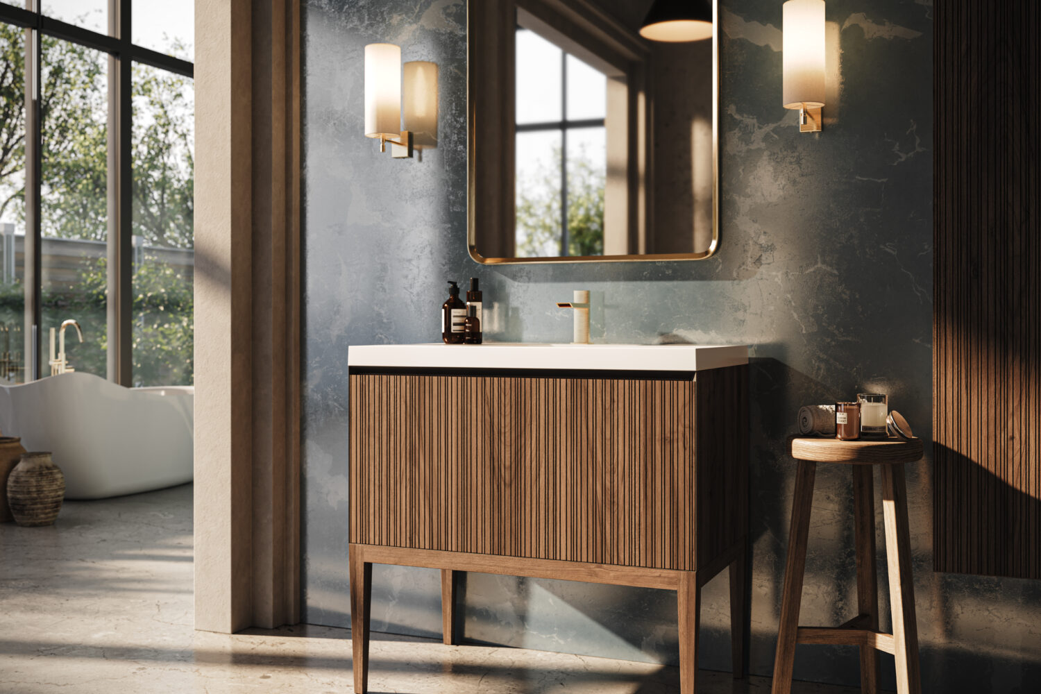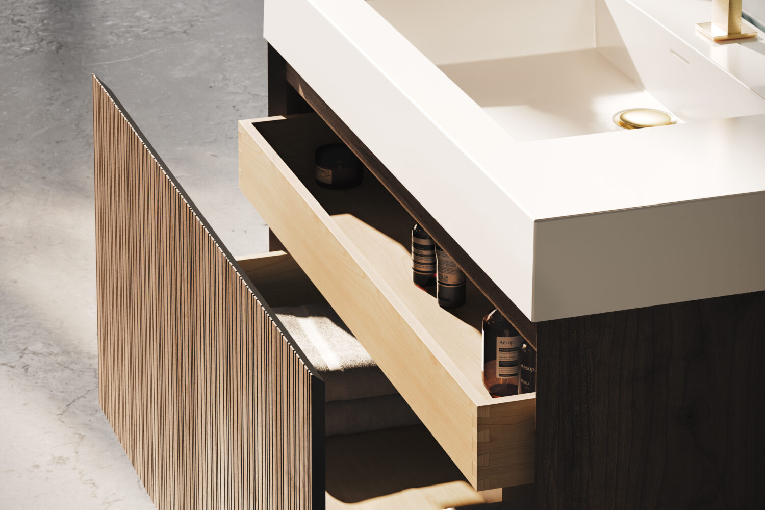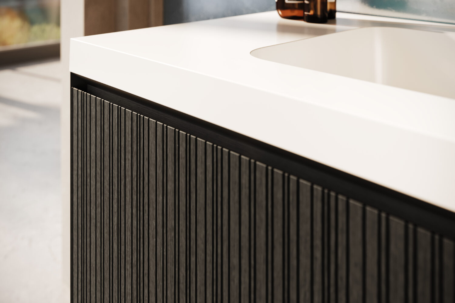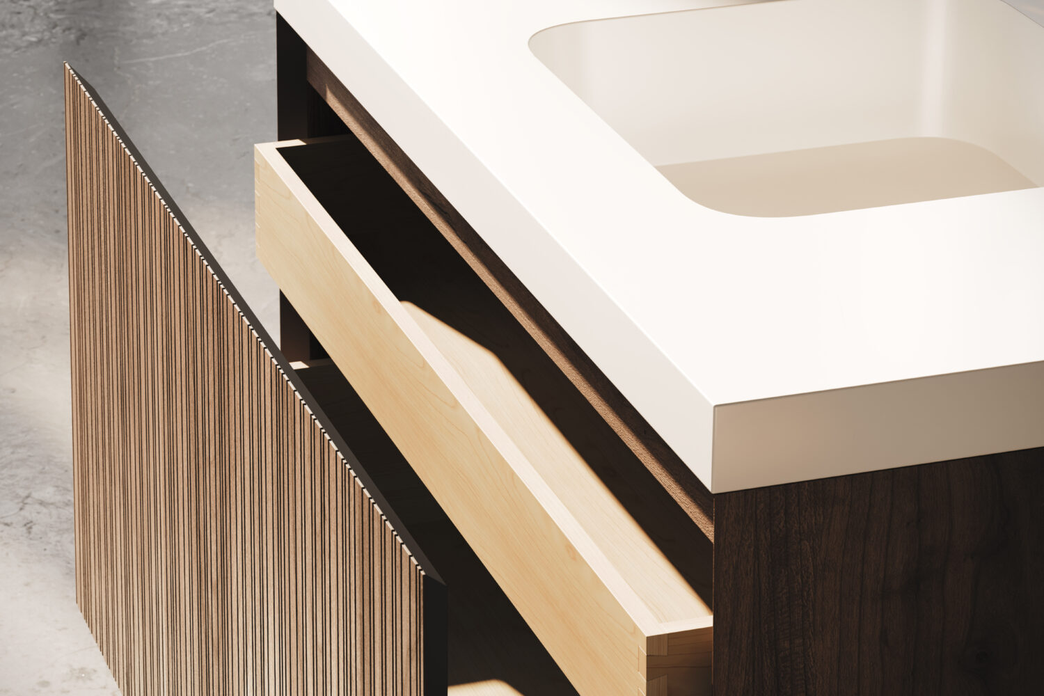 Rayado features a musical pattern of vertical grooves in the drawer façade creating a rich texture that exudes warmth and refinement.